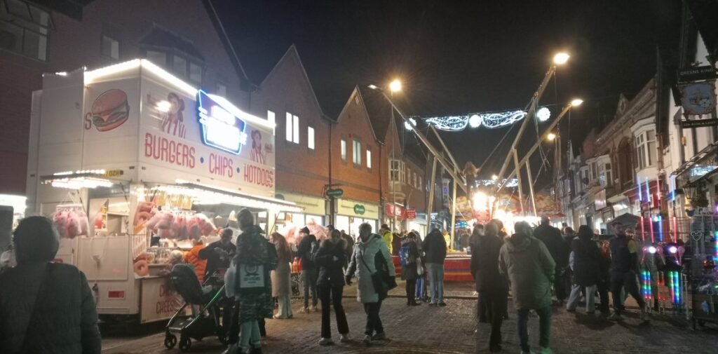 When Rushden’s Town Mayor, Cllr. Gill Mercer, switched the Lights on, the Street was filled with revellers. The lights of the fairground rides and the stalls all added to the sparkle.